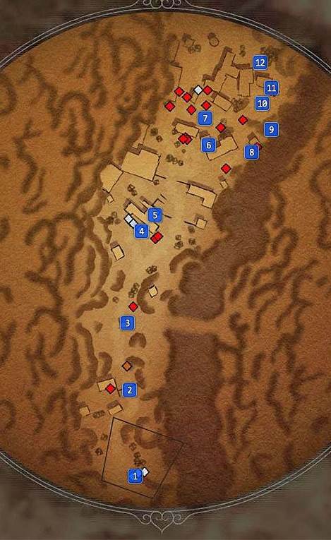 Теперь идите вперед и откройте сундуки справа за маленьким зданием. Пришло время заняться западной стороной области. Вы увидите, что 2 длинных пальто патрулируют внешнюю территорию, в то время как у нас есть пончо на западе, смотрящее на восток, и 3 врага посередине. Вы также заметите, что на севере есть лестница.