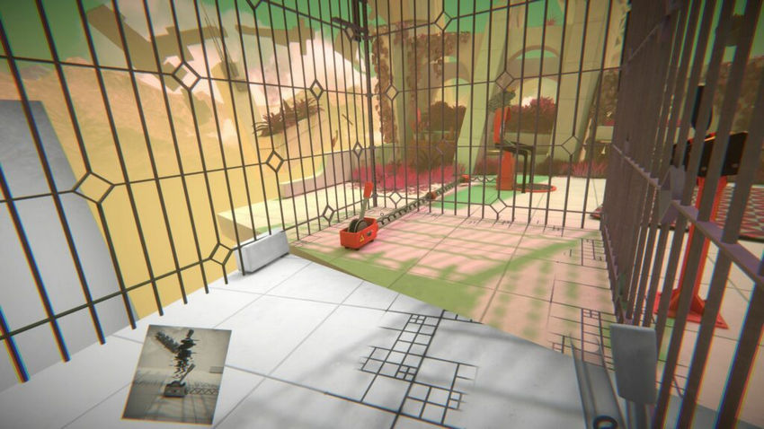 Переверните красный рычаг, а затем поместите другое фото, чтобы выбраться из клетки. Используйте телепорт, чтобы двигаться дальше.