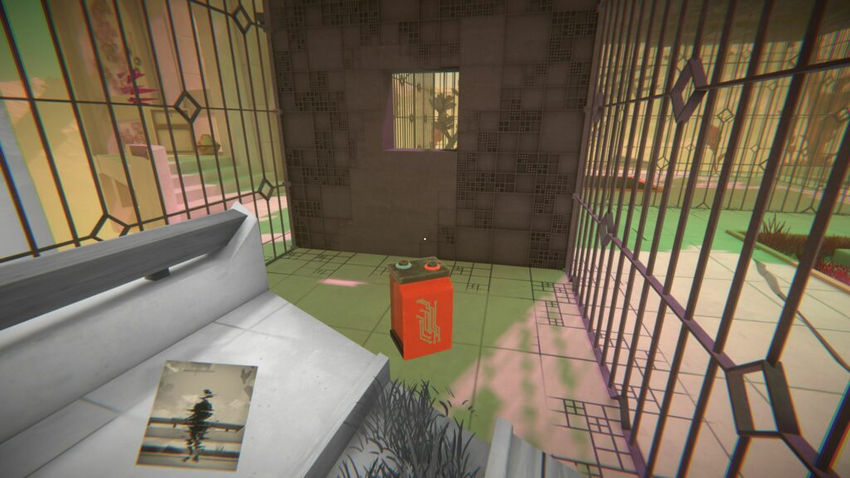 Наклоните фотографию так, чтобы она обрезала часть ограждения, но не разрезала батарею пополам. Это очень важно. Возьмите батарею и принесите ее к телепорту. Следующая батарея находится внутри комнаты без дверей. Используйте вторую фотографию, чтобы попасть в комнату.